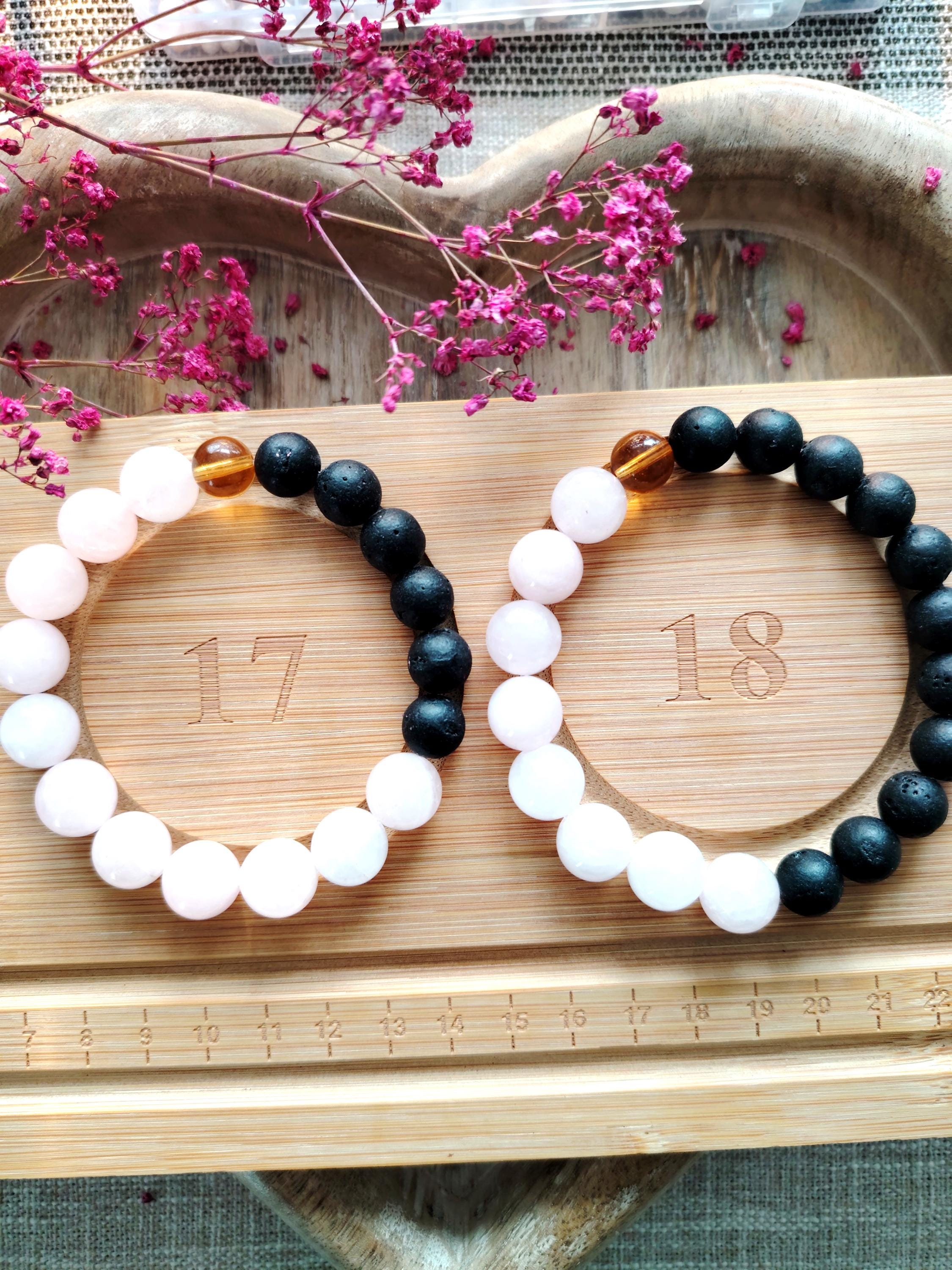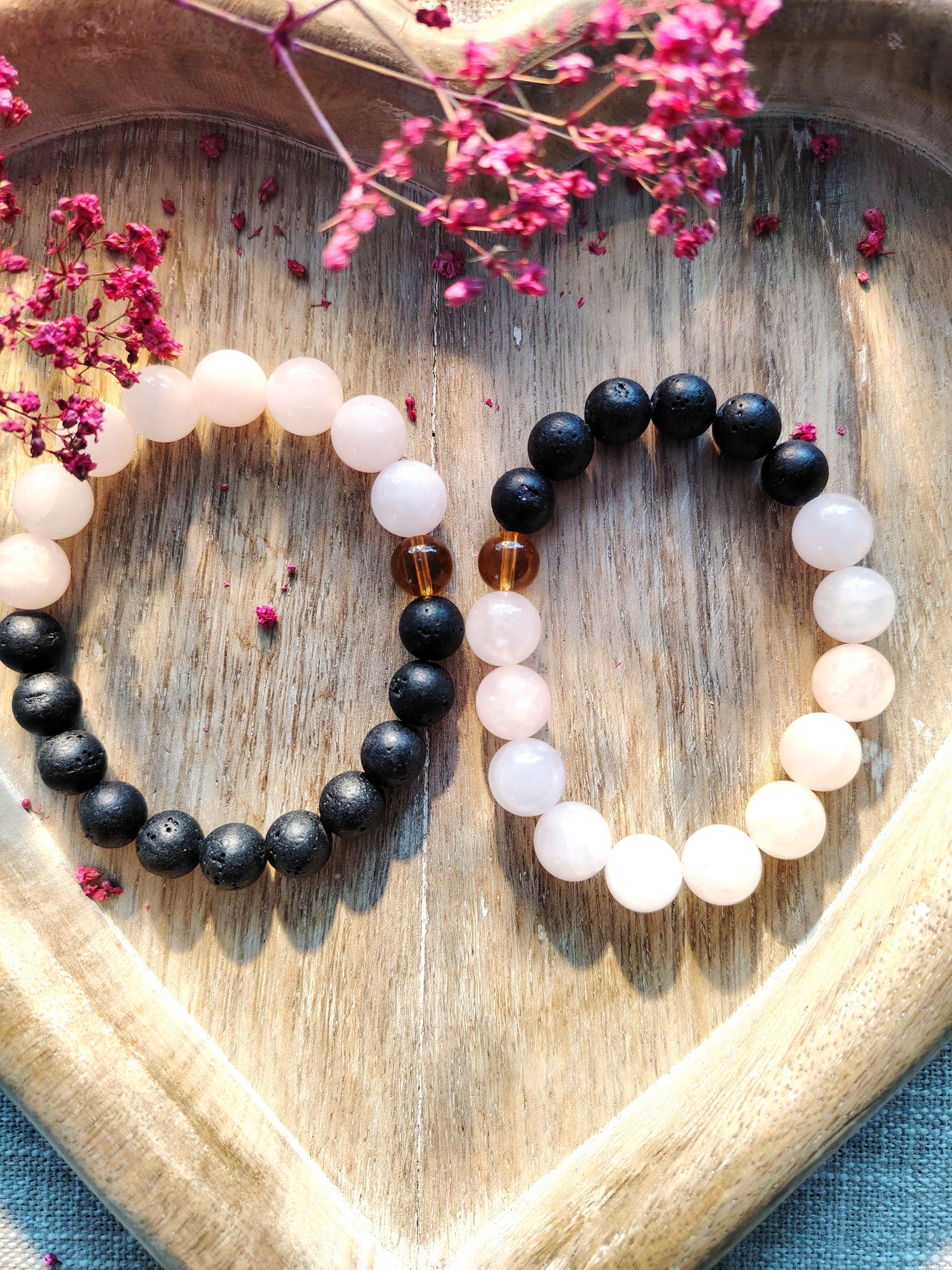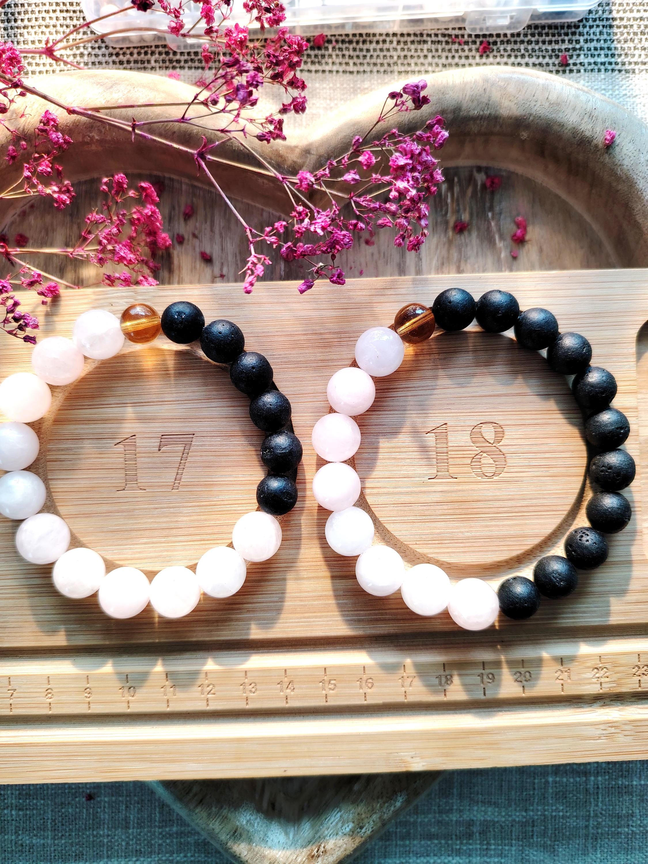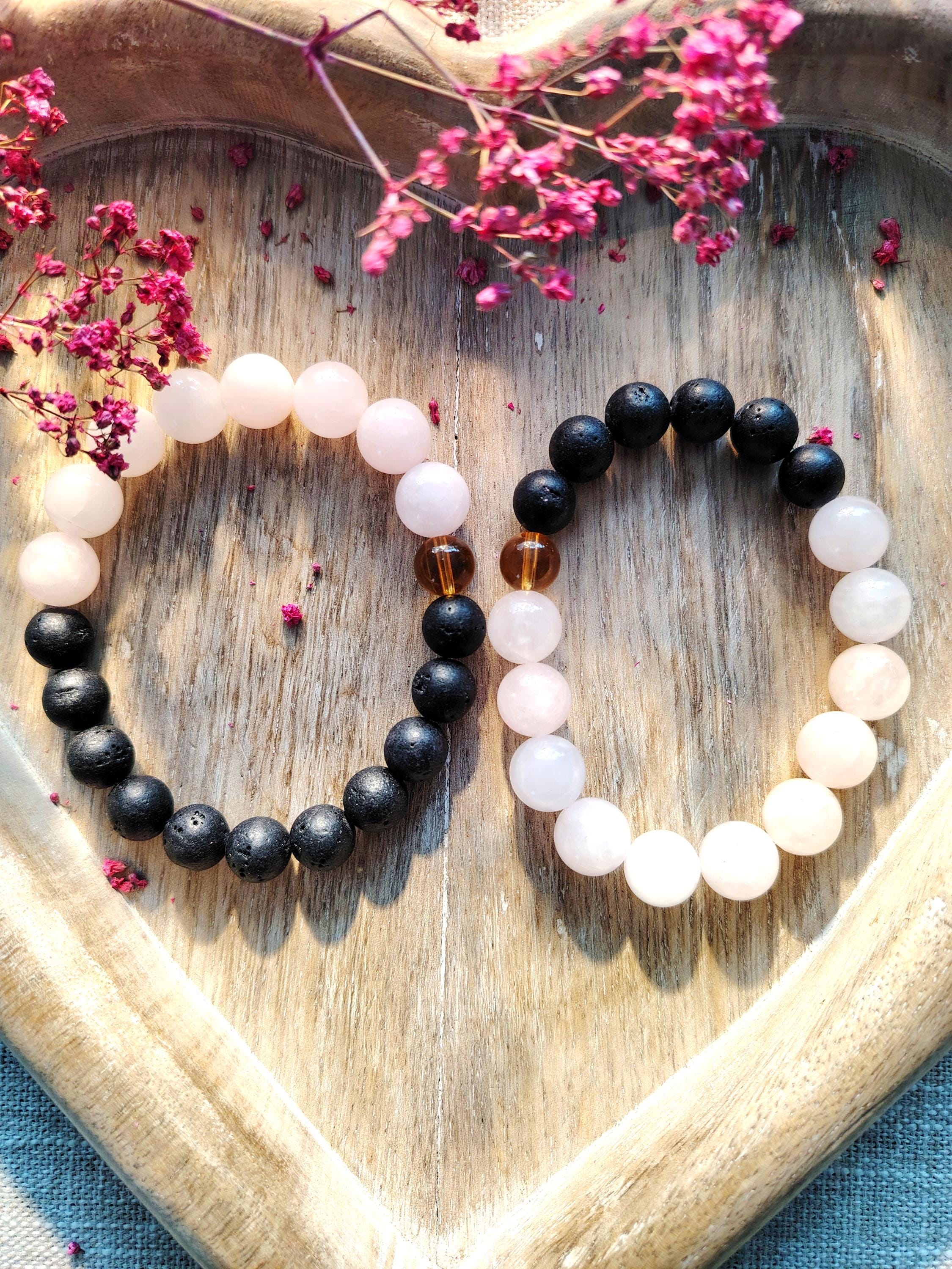 A matching couple bracelet set made with natural rose quartz and black obsidian. Rose quartz represents love and emotional harmony, while obsidian symbolises protection and grounding—together expressing a balanced and meaningful connection between two people. Each bracelet is hand‑strung with polished beads for a smooth, comfortable fit, making it a thoughtful gift for couples.