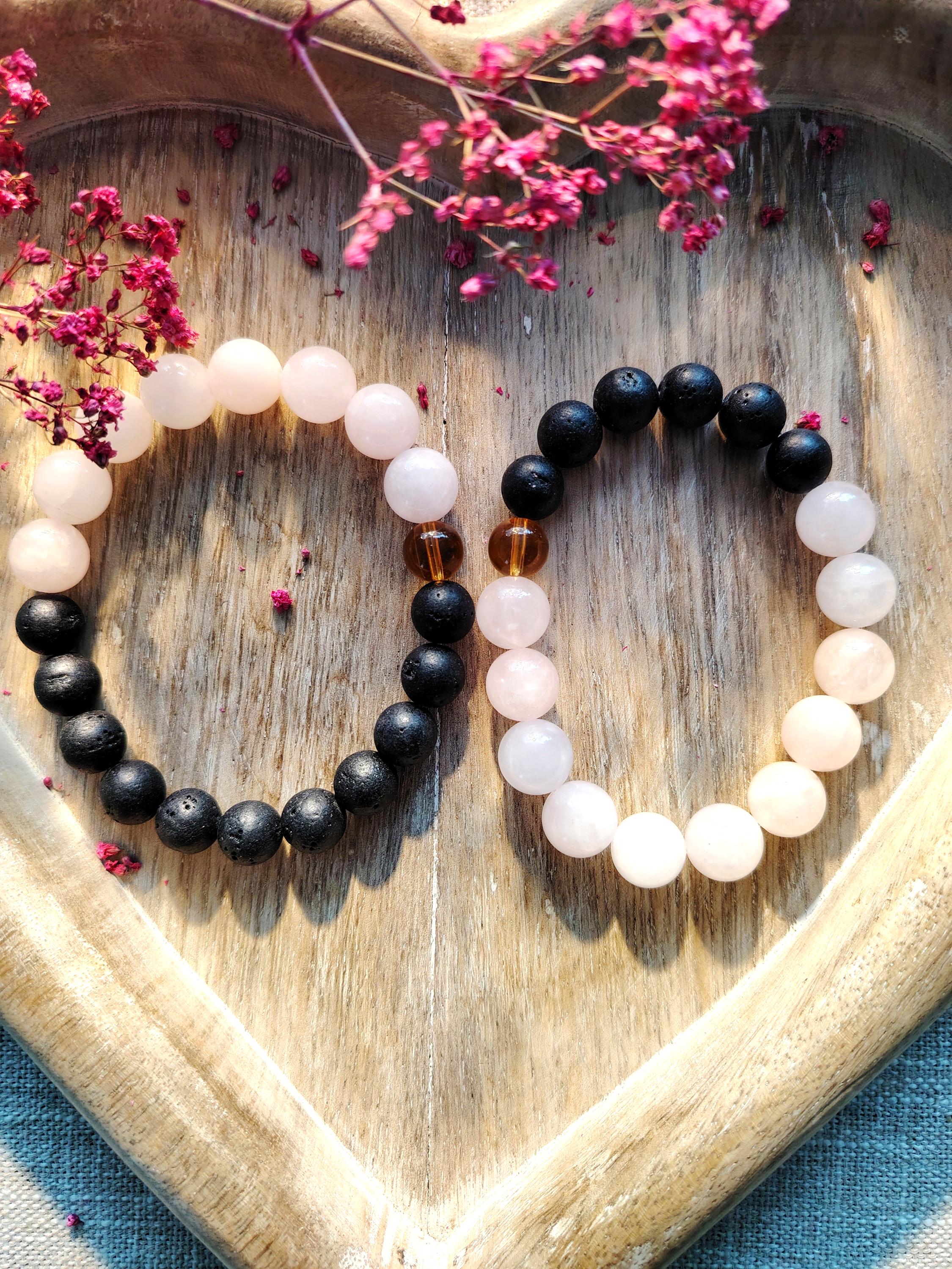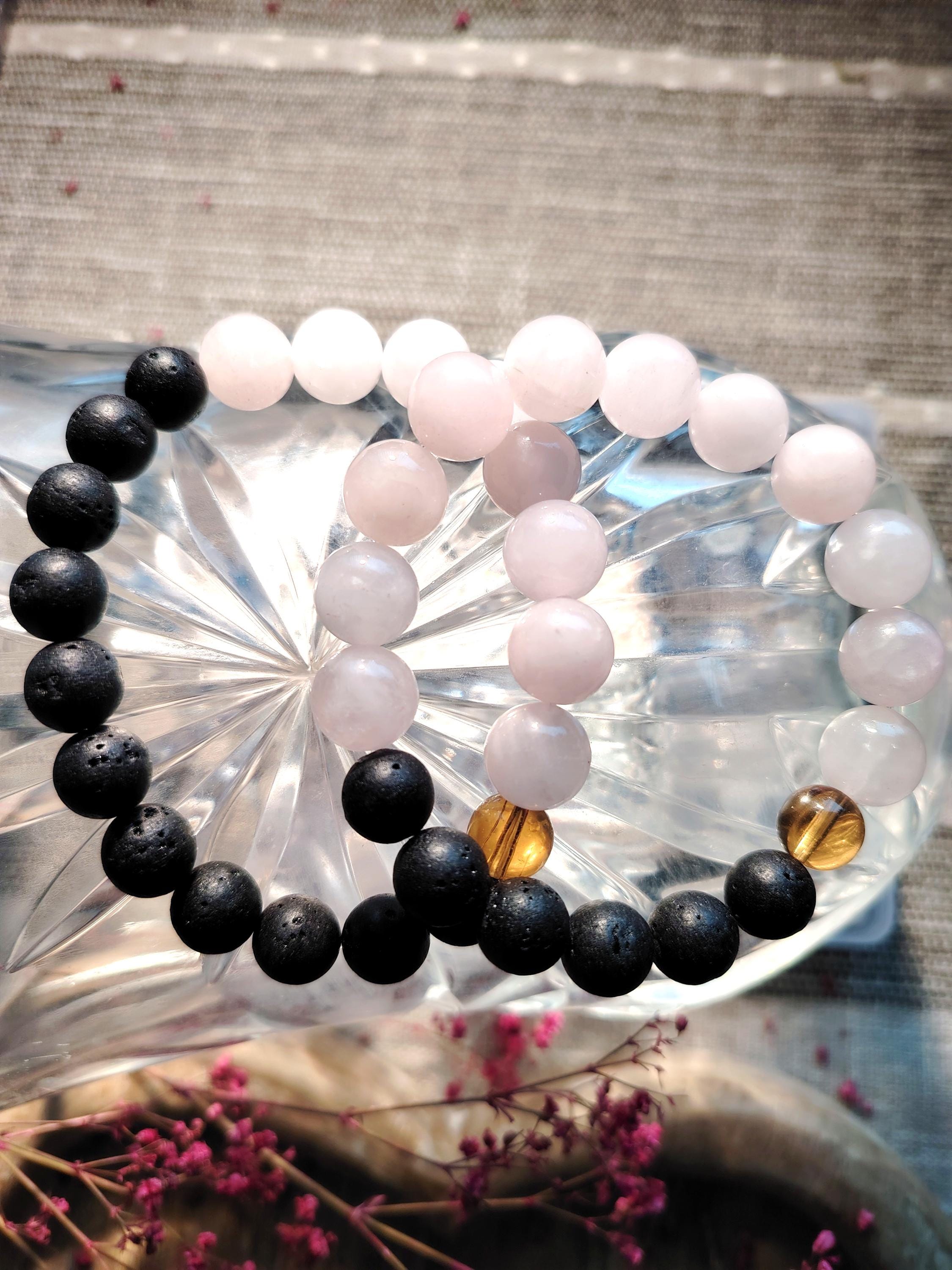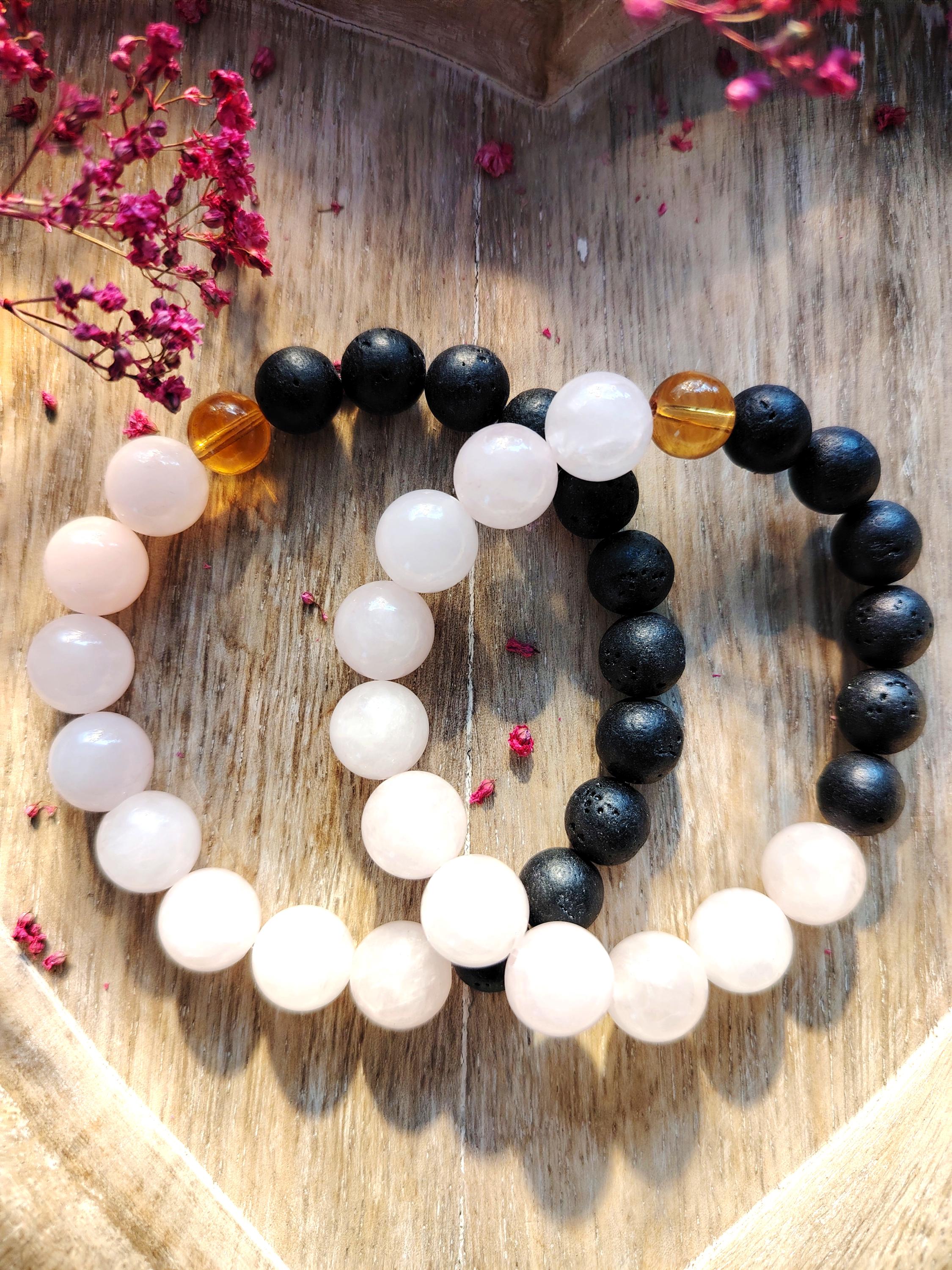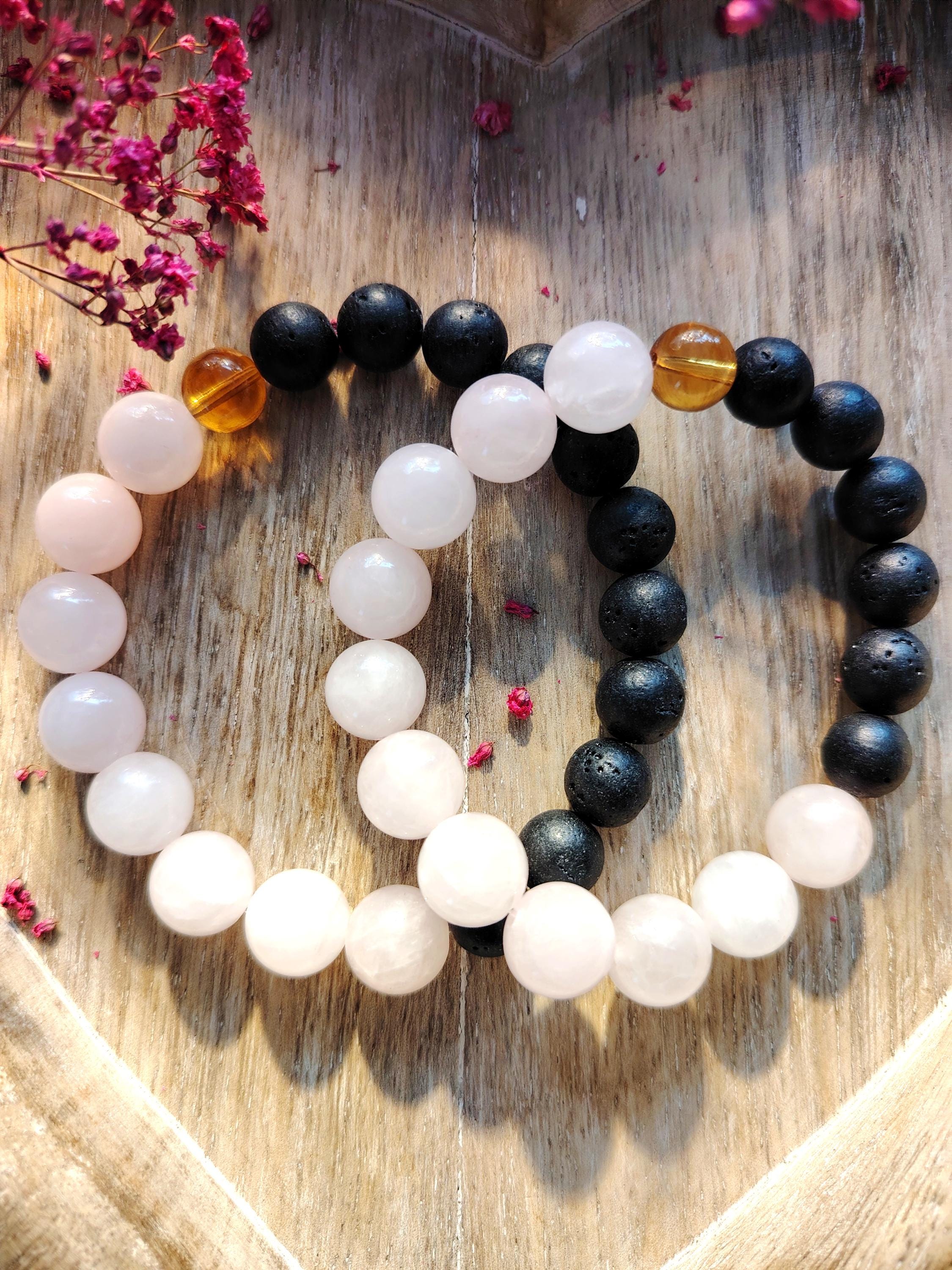 A matching couple bracelet set made with natural rose quartz and black obsidian. Rose quartz represents love and emotional harmony, while obsidian symbolises protection and grounding—together expressing a balanced and meaningful connection between two people. Each bracelet is hand‑strung with polished beads for a smooth, comfortable fit, making it a thoughtful gift for couples.