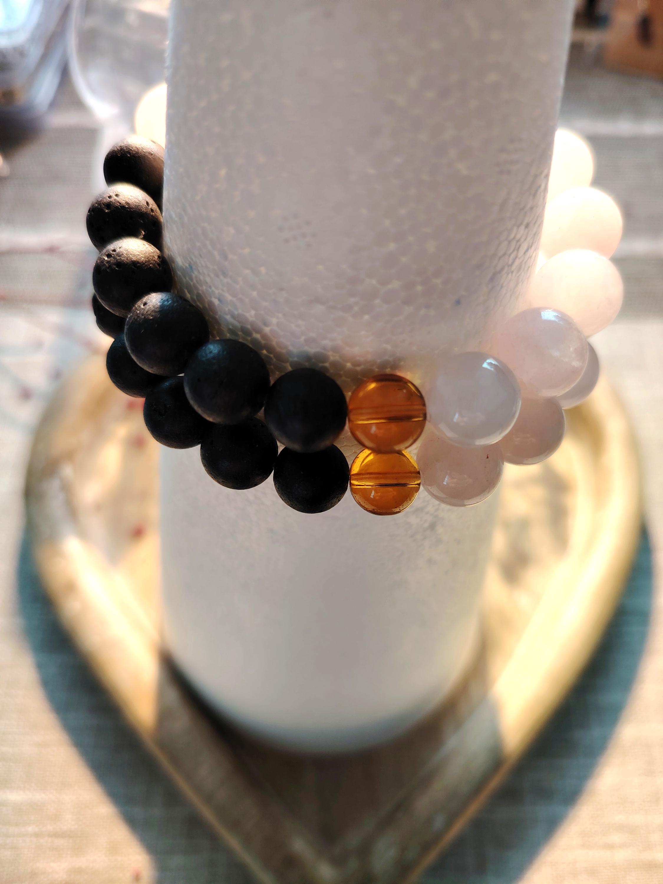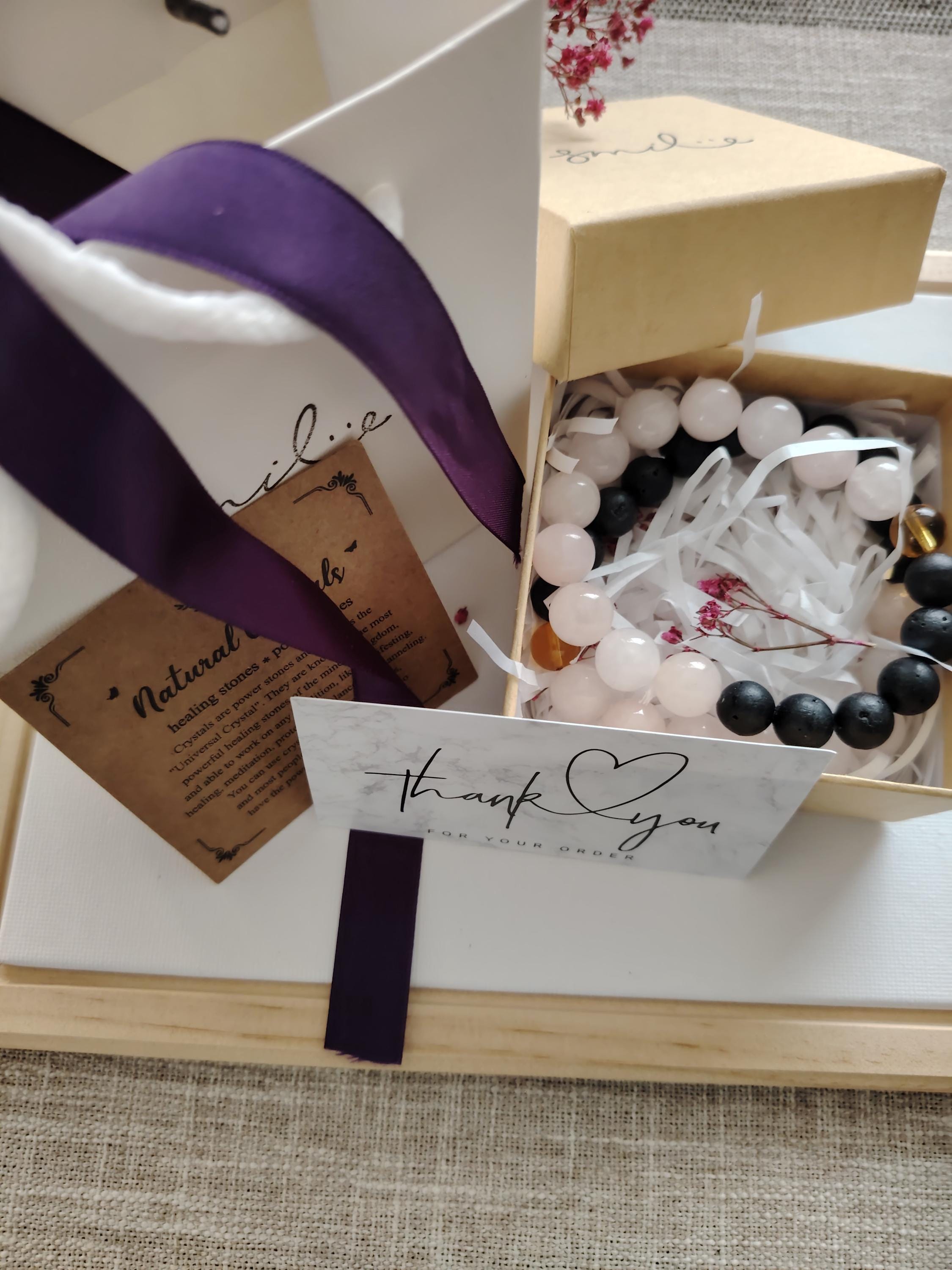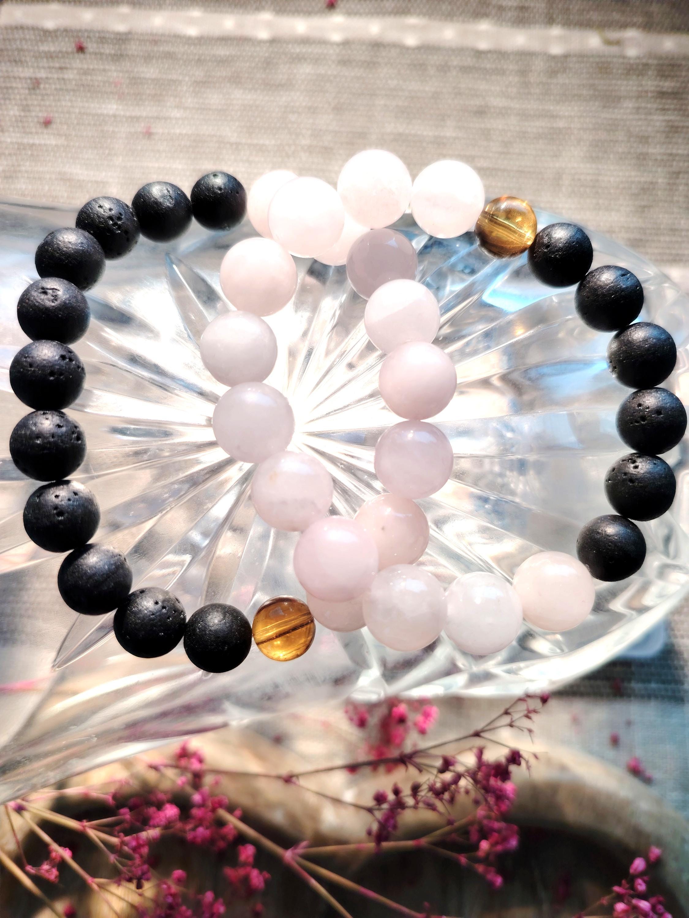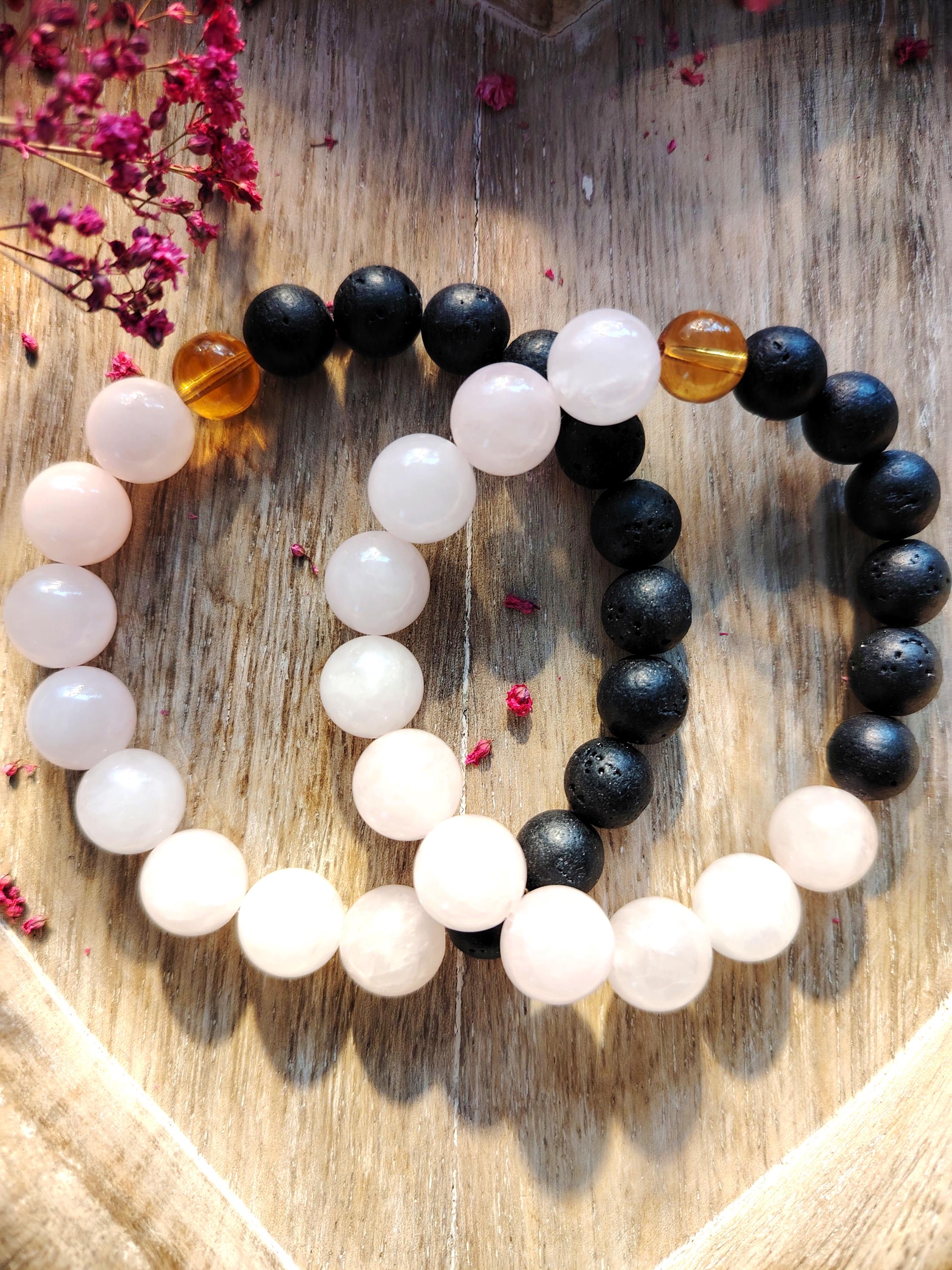 A matching couple bracelet set made with natural rose quartz and black obsidian. Rose quartz represents love and emotional harmony, while obsidian symbolises protection and grounding—together expressing a balanced and meaningful connection between two people. Each bracelet is hand‑strung with polished beads for a smooth, comfortable fit, making it a thoughtful gift for couples.