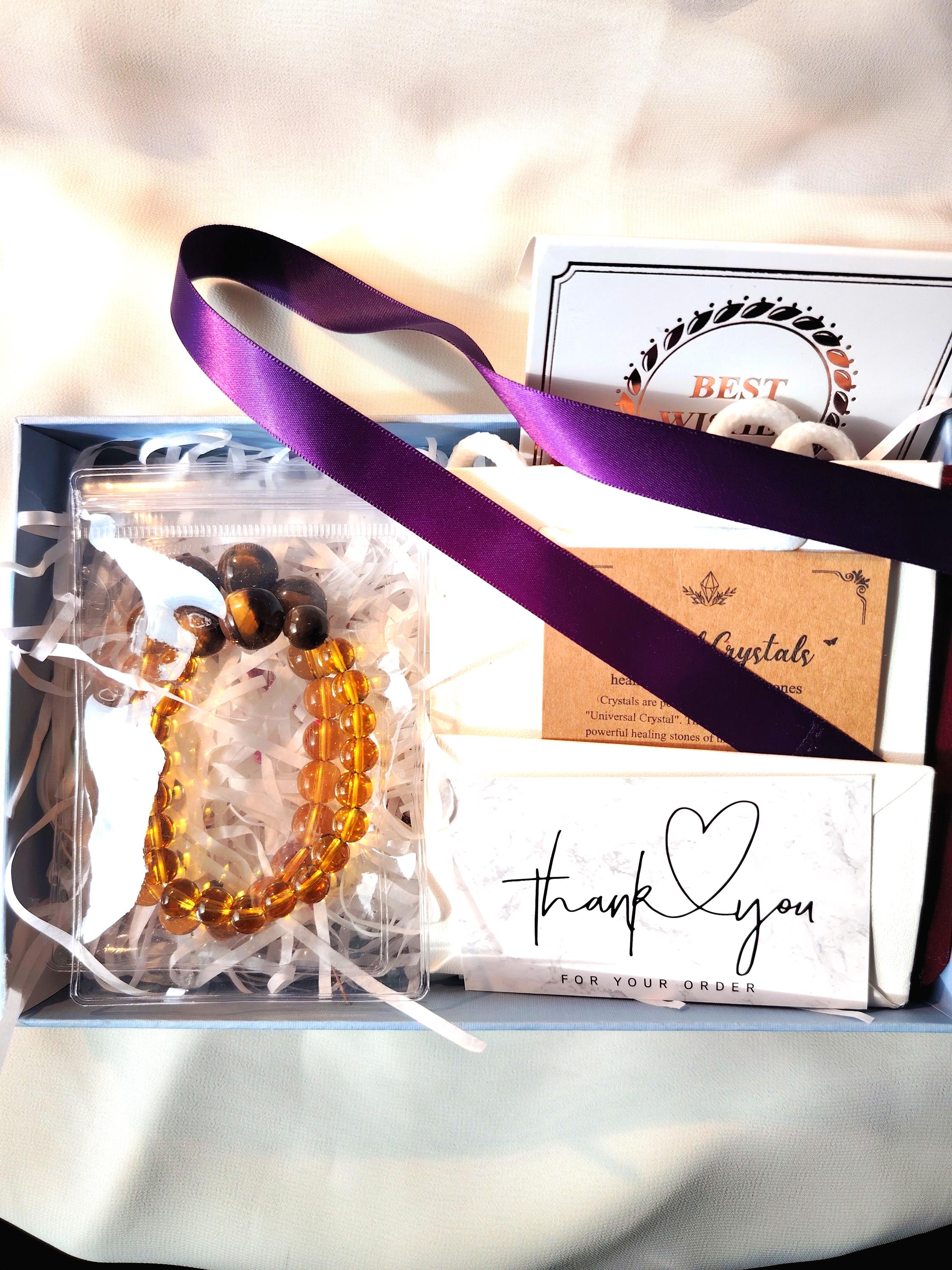 Citrine shines with warm golden light, symbolising joy, clarity, and the courage to move forward. Tiger’s eye brings grounding strength and steady protection, a quiet reminder that love can be both gentle and powerful.