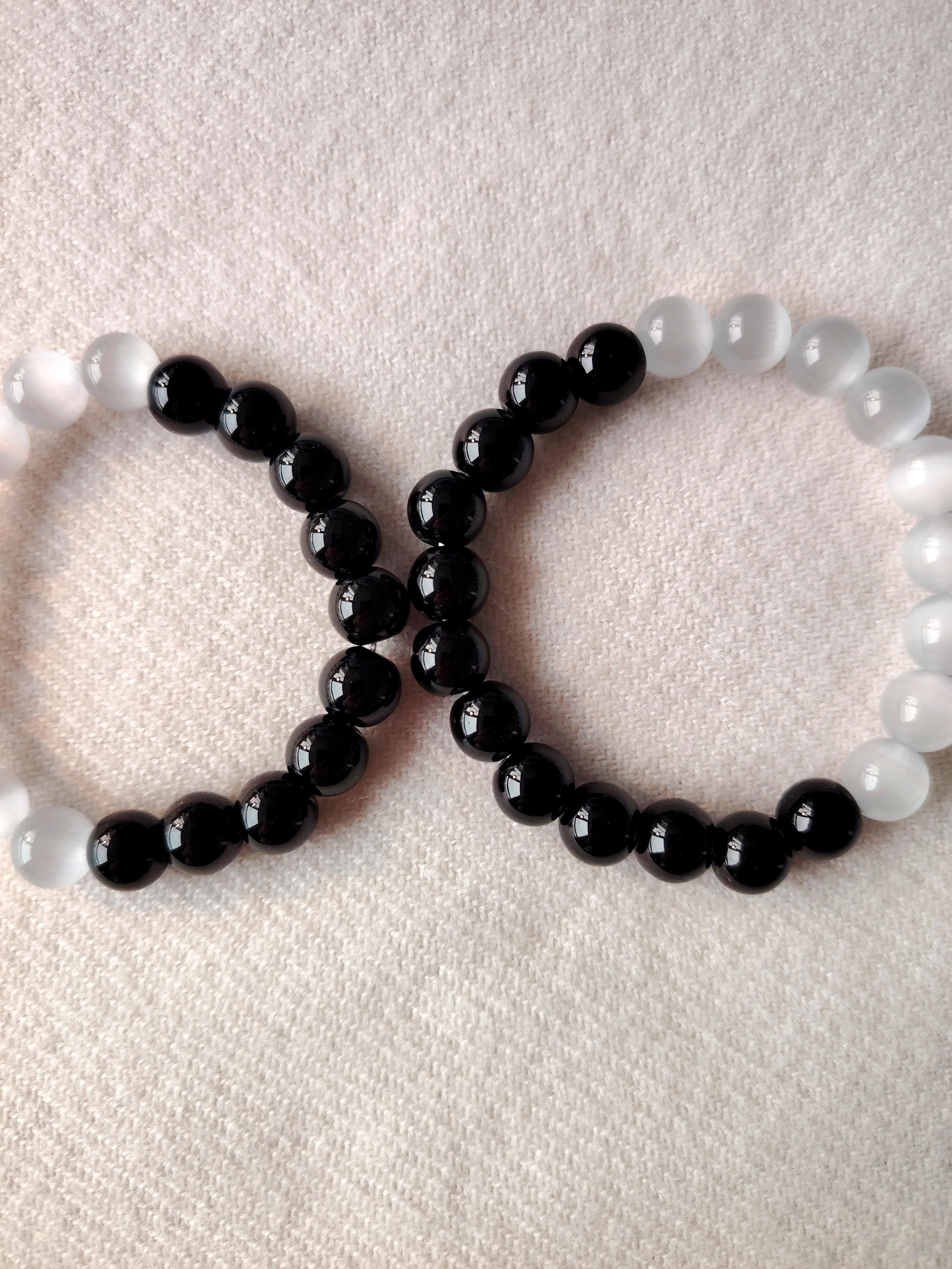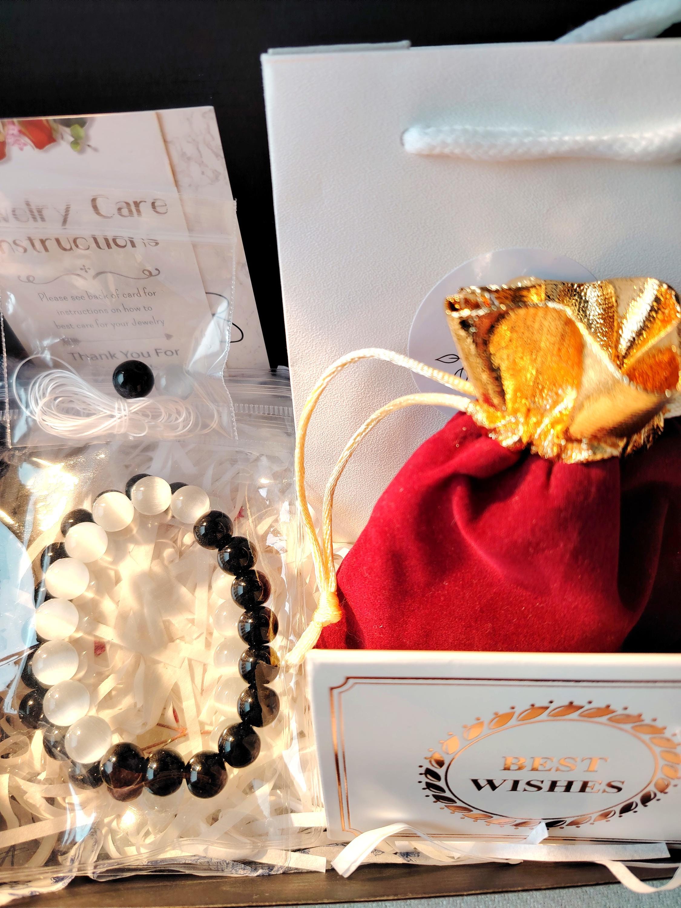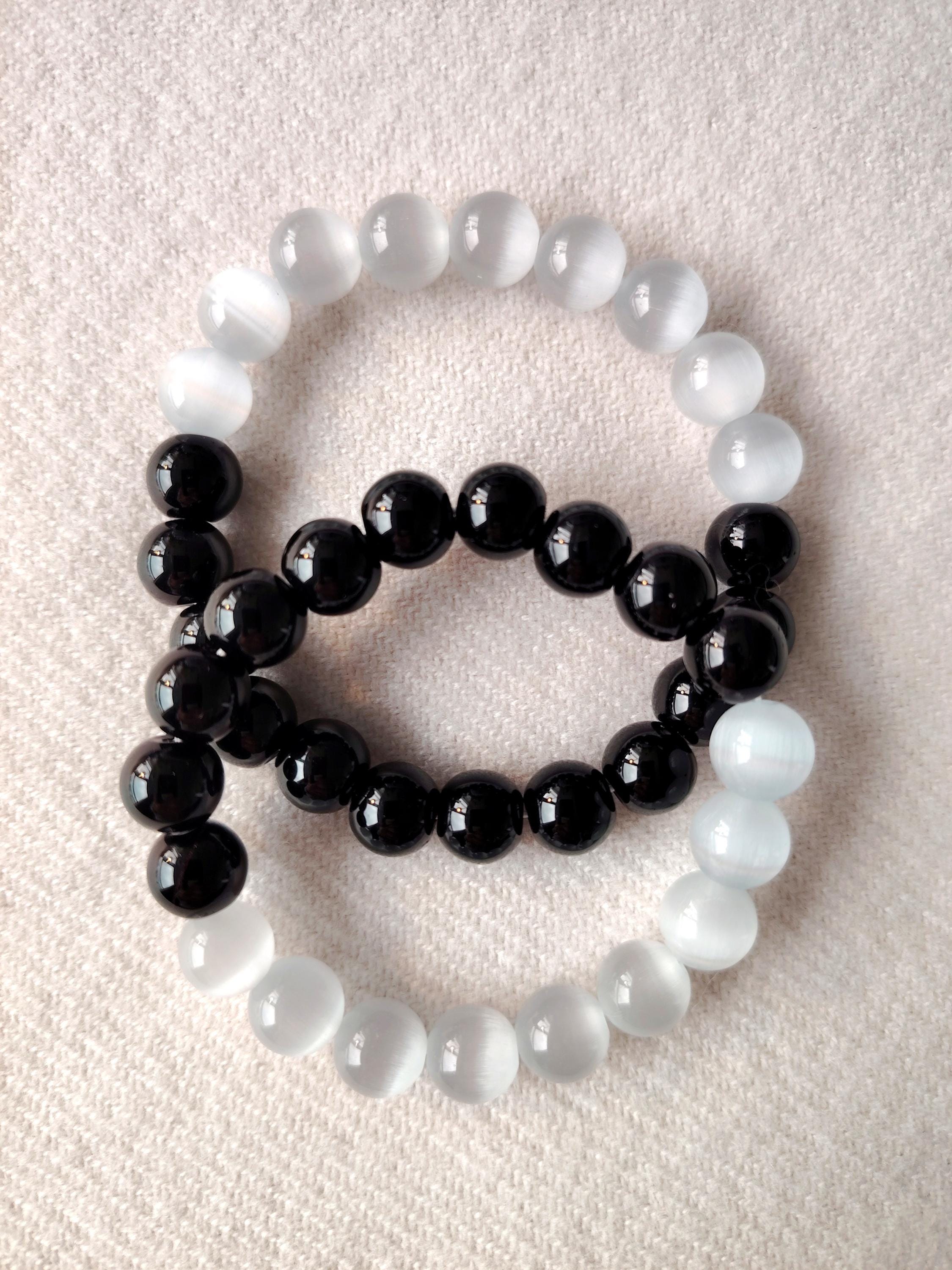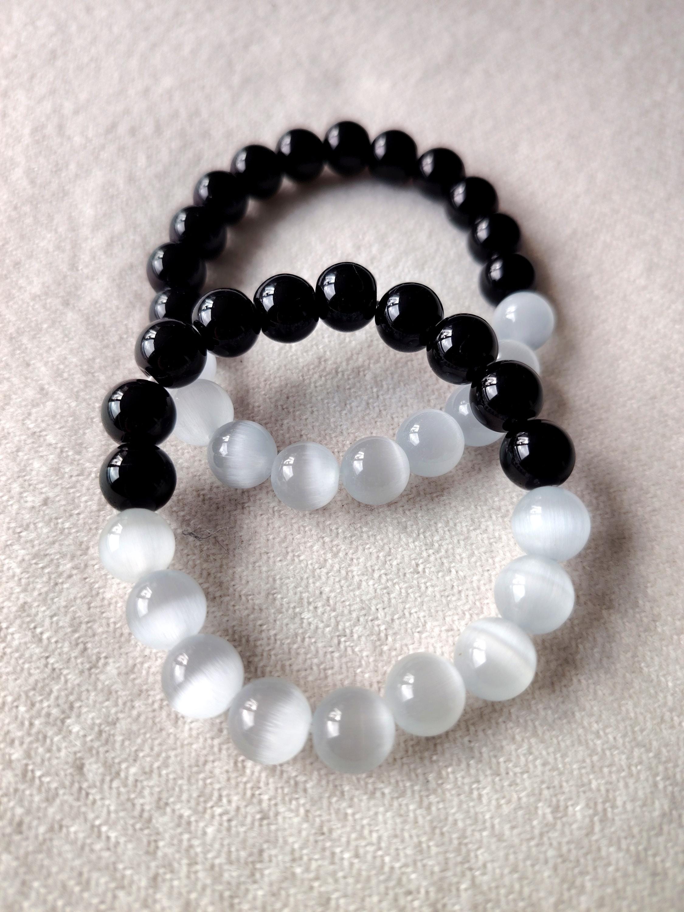 This matching bracelet set pairs Moonstone and Black Agate—two gemstones that reflect the balance of a deep, steady relationship.