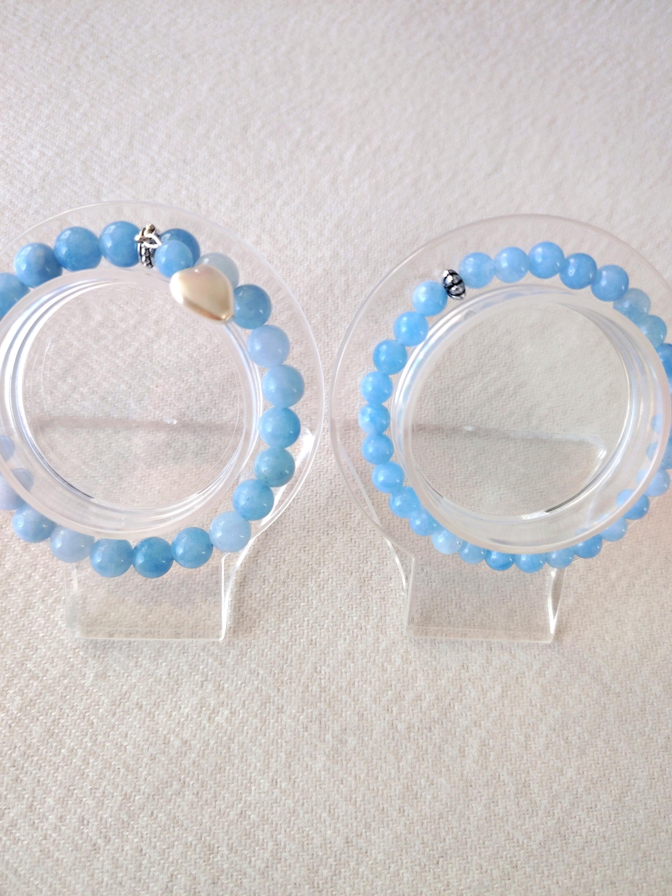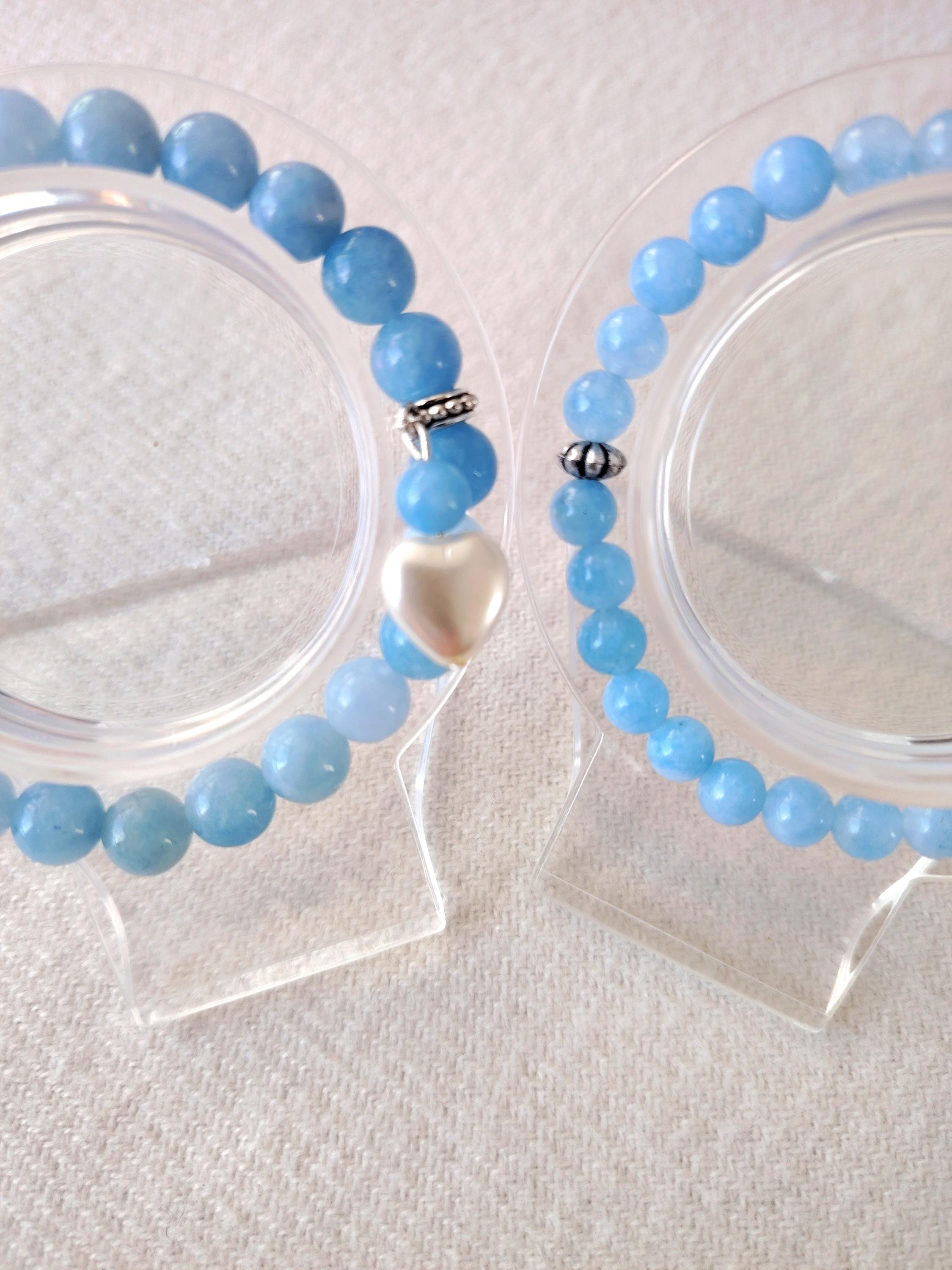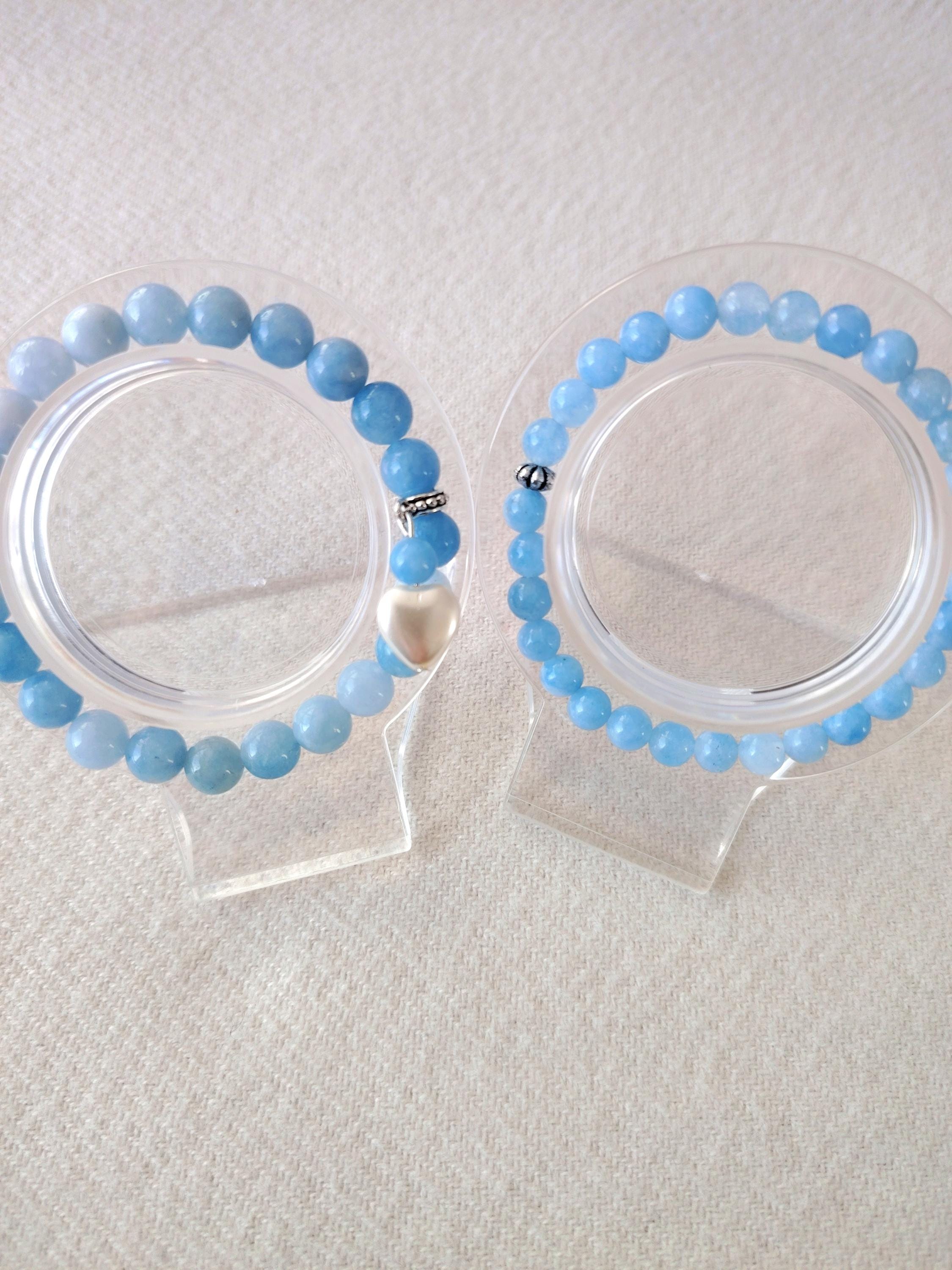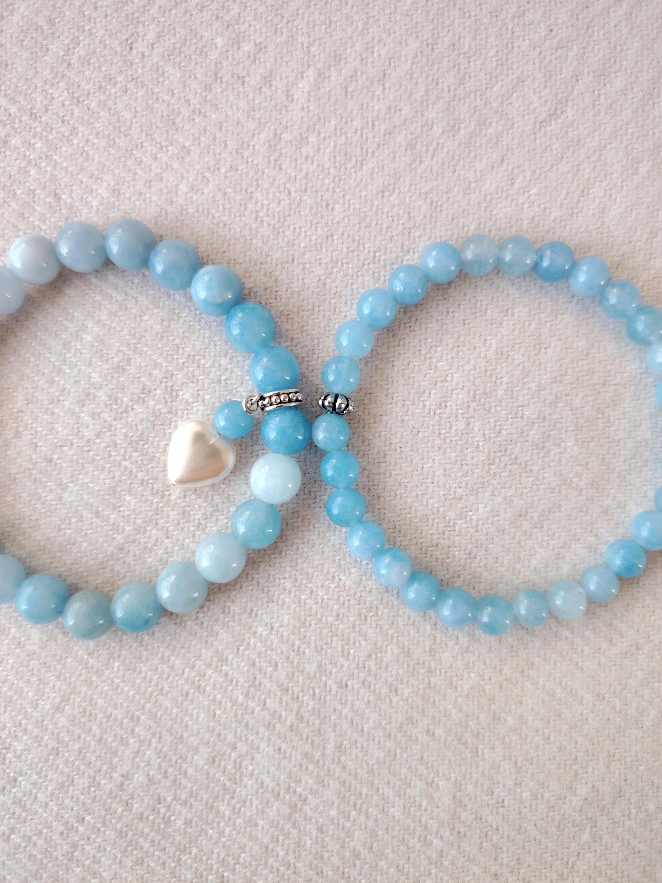 A pair of aquamarine couple bracelets symbolising calm love, honest communication, and a bond as pure and endless as the sea. Aquamarine’s gentle blue energy blesses the relationship with harmony, trust, and a future filled with clarity and peace.