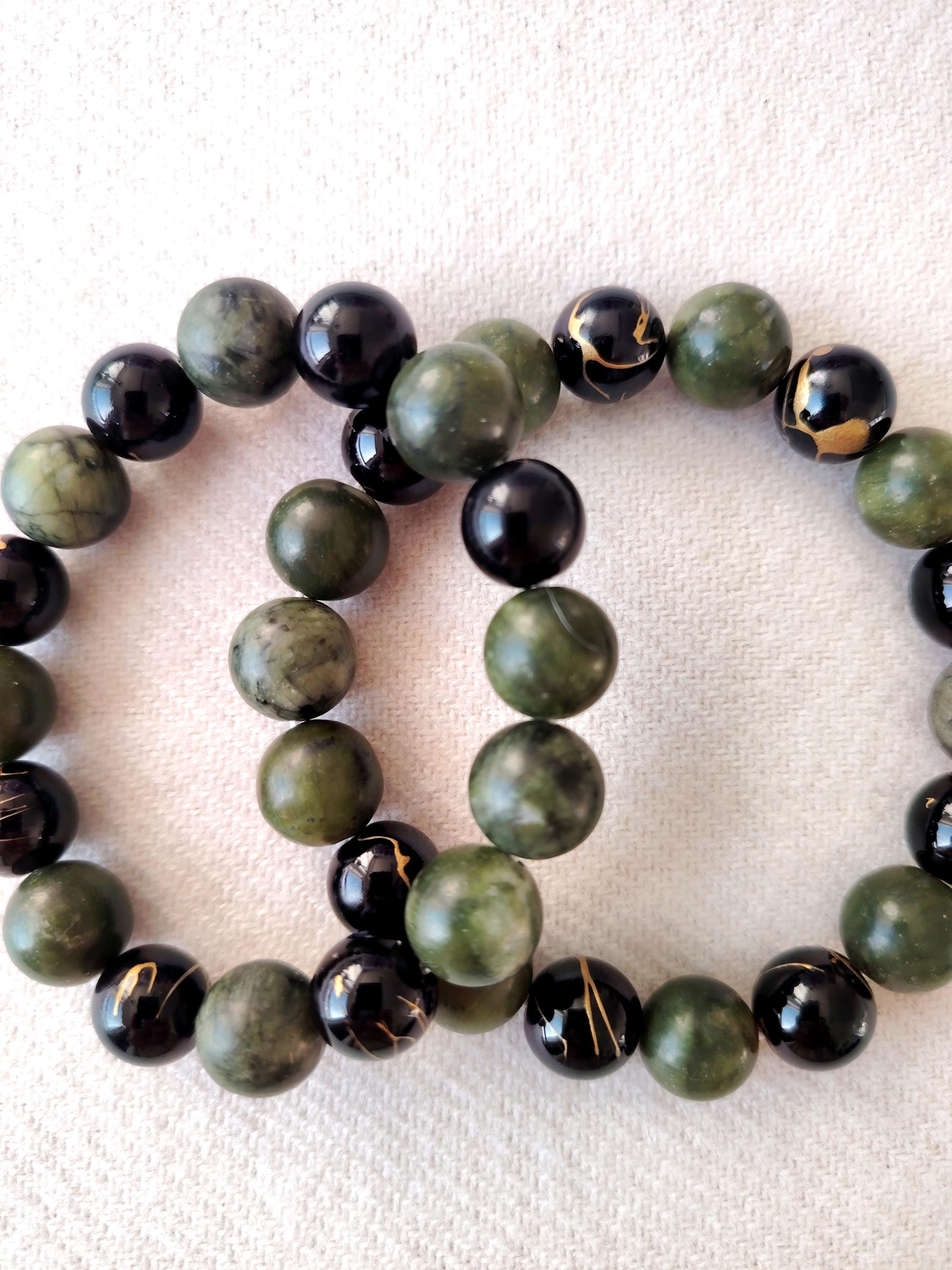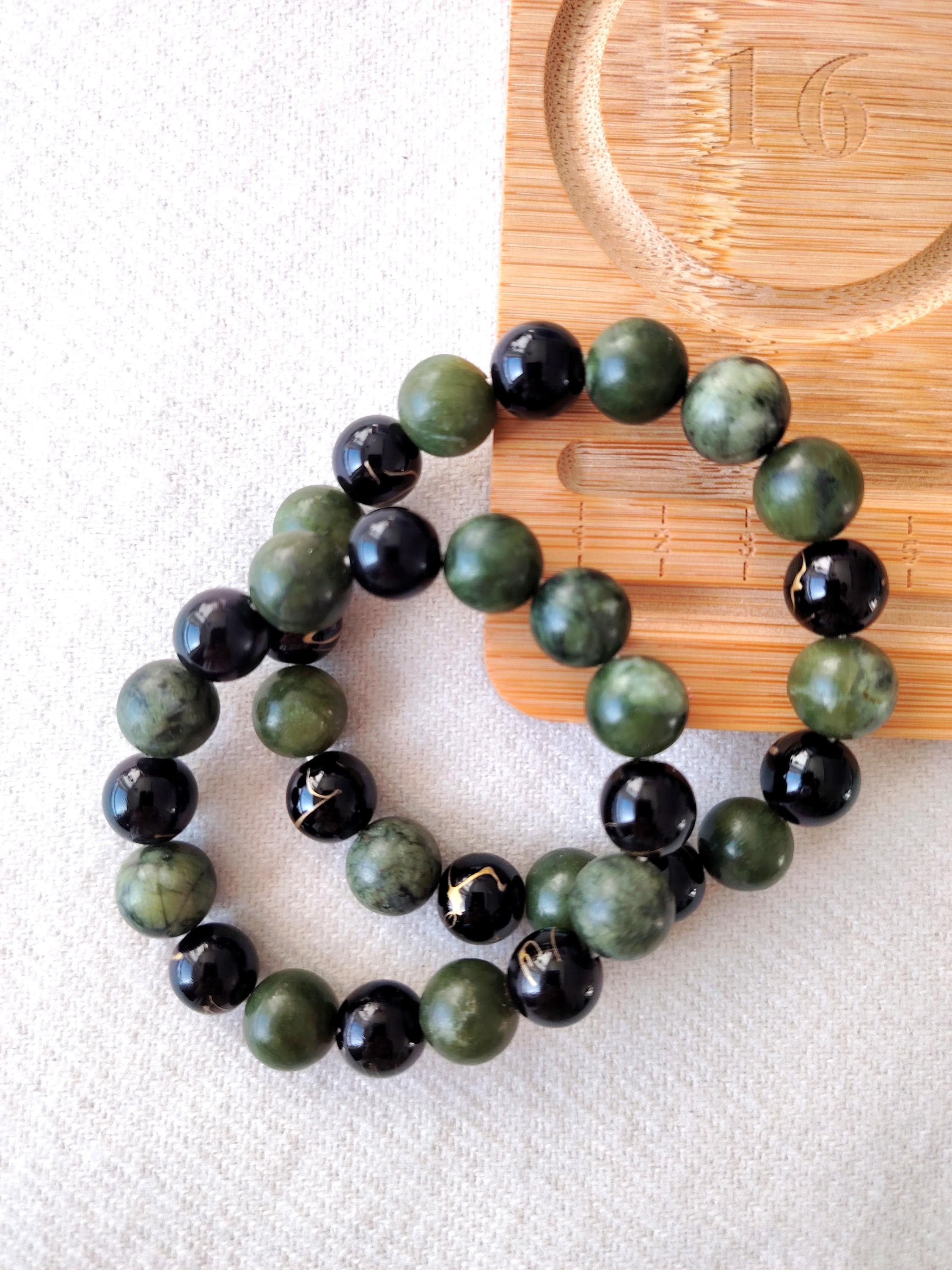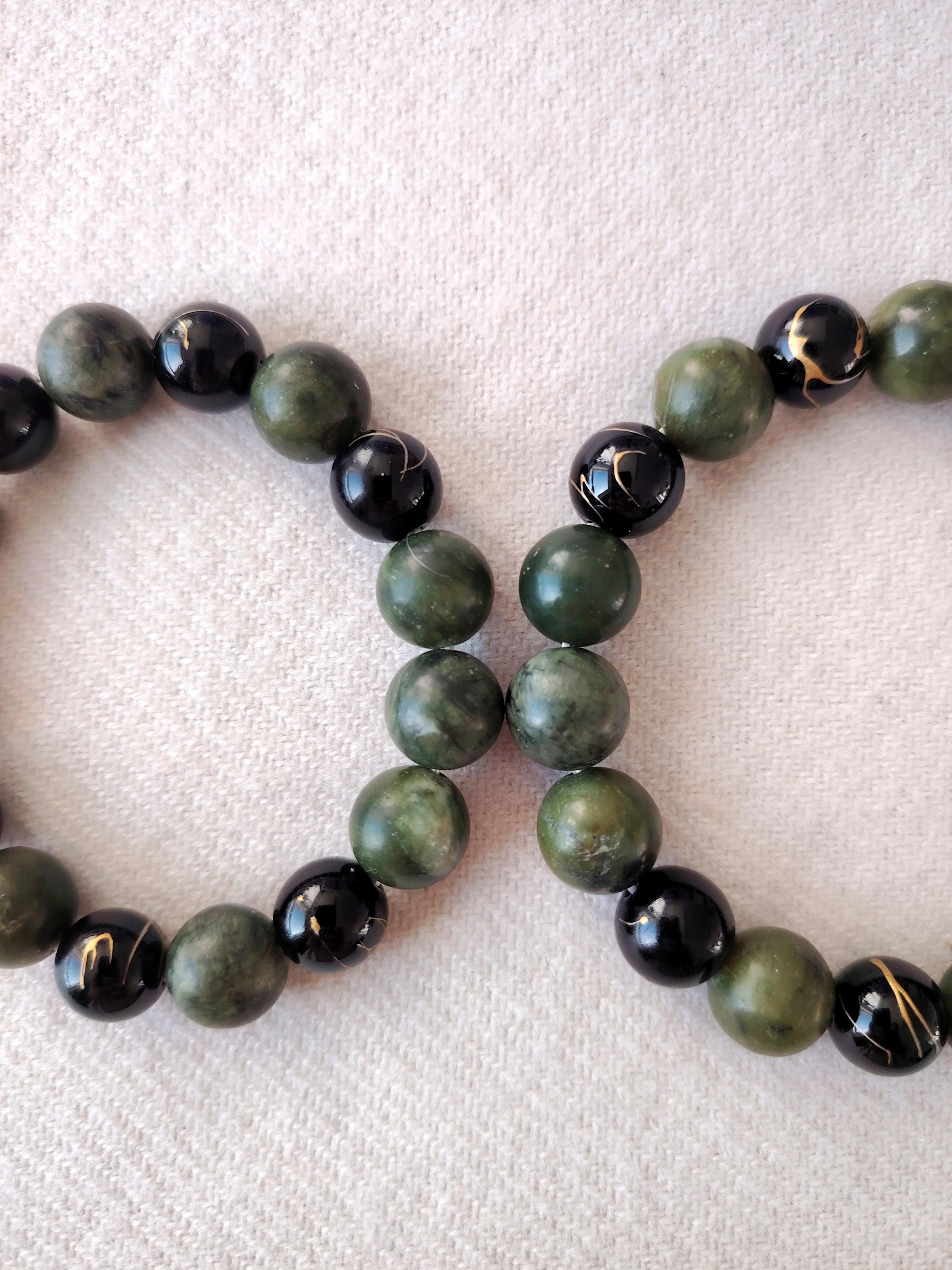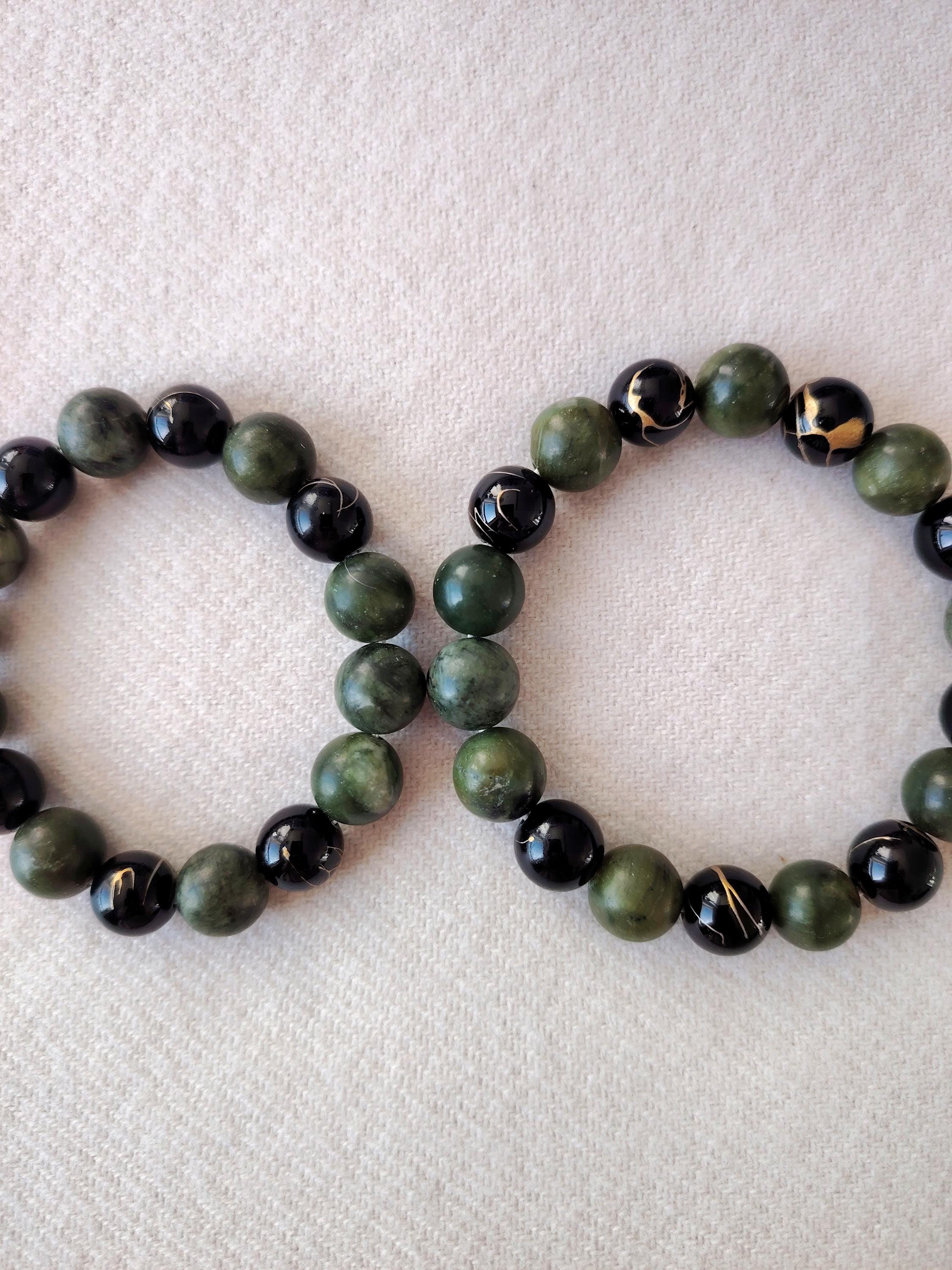 Couples Bracelets • Black Gold & Green Agate Gemstone Set (12mm Beads)