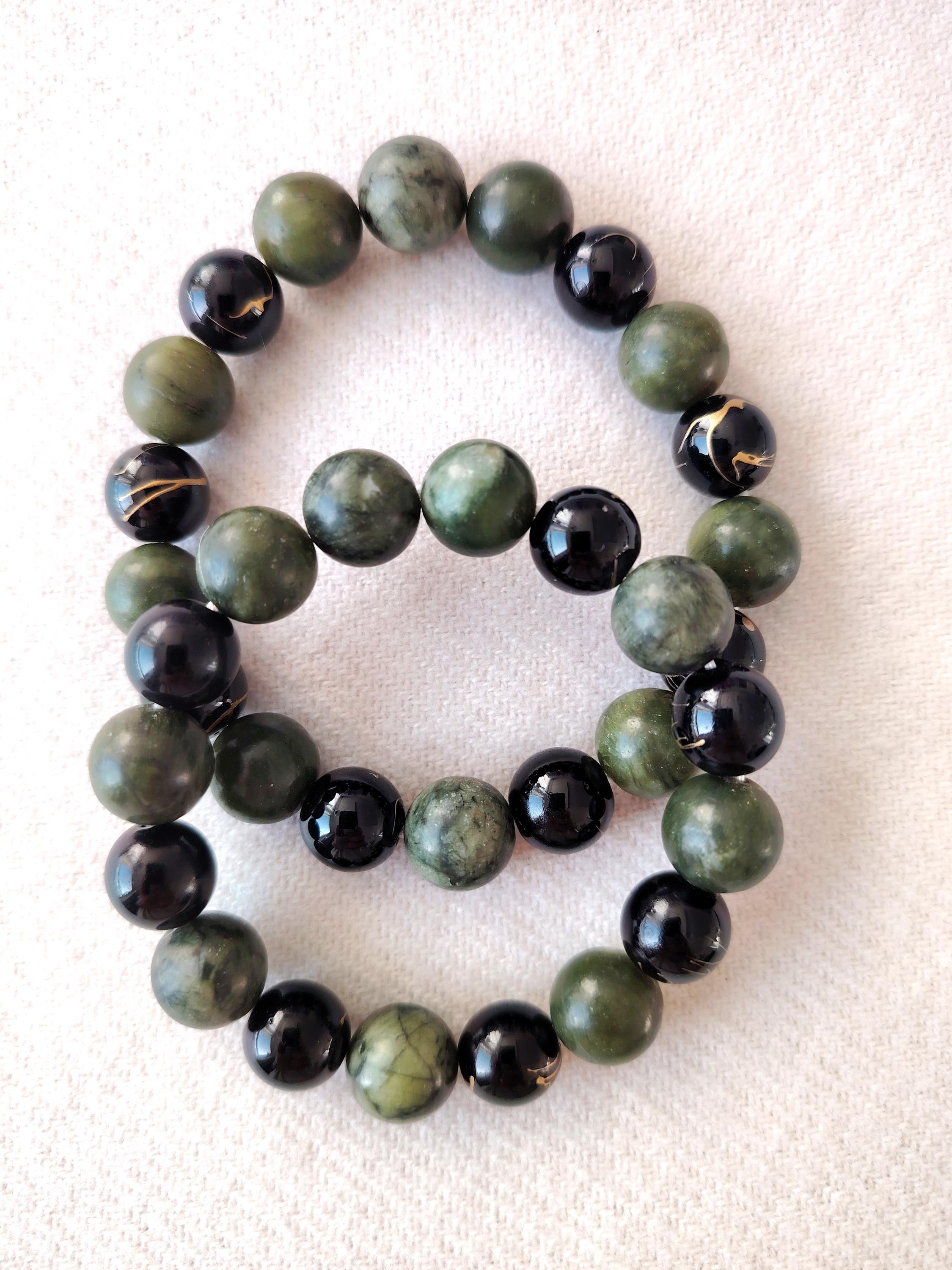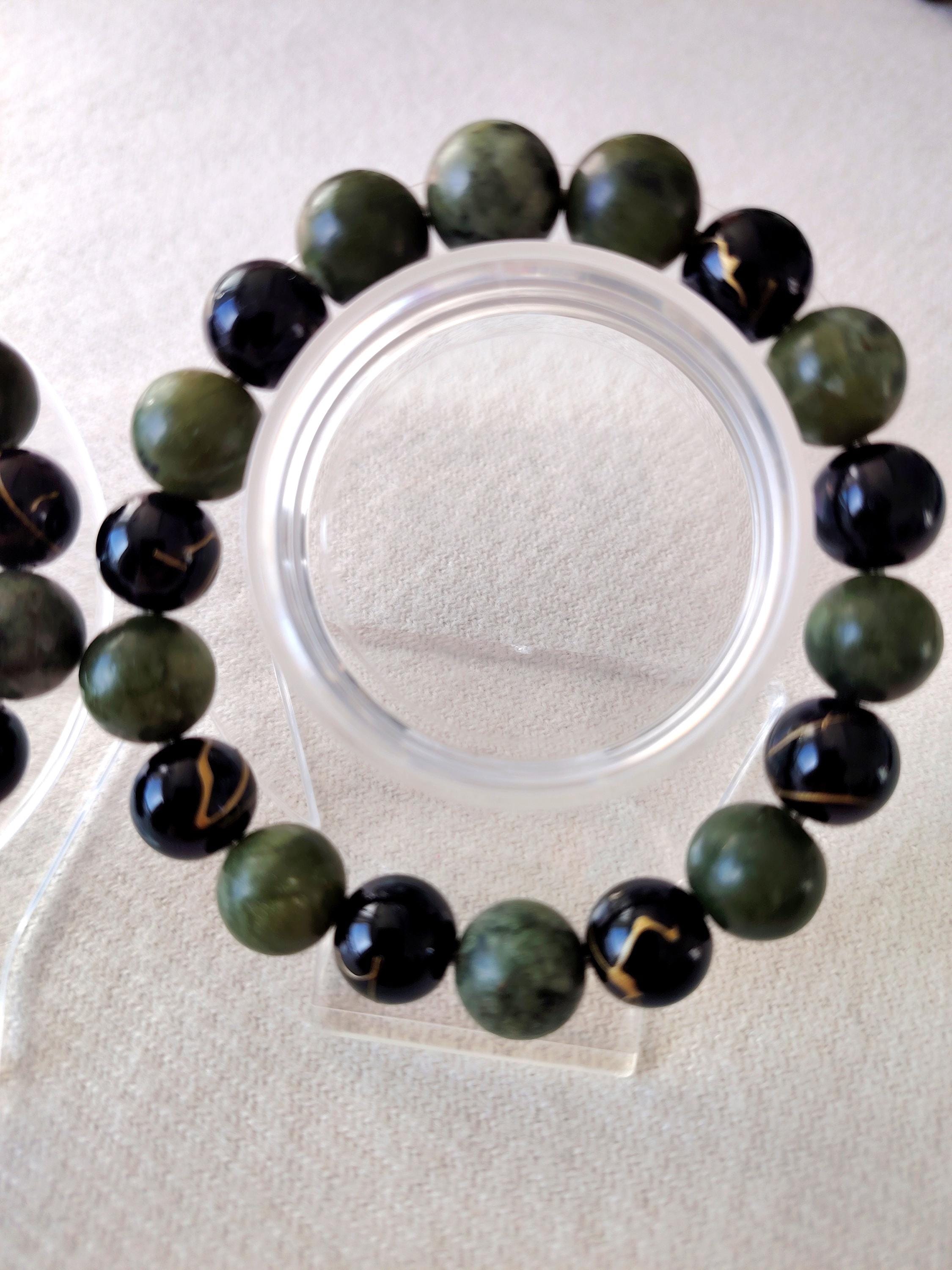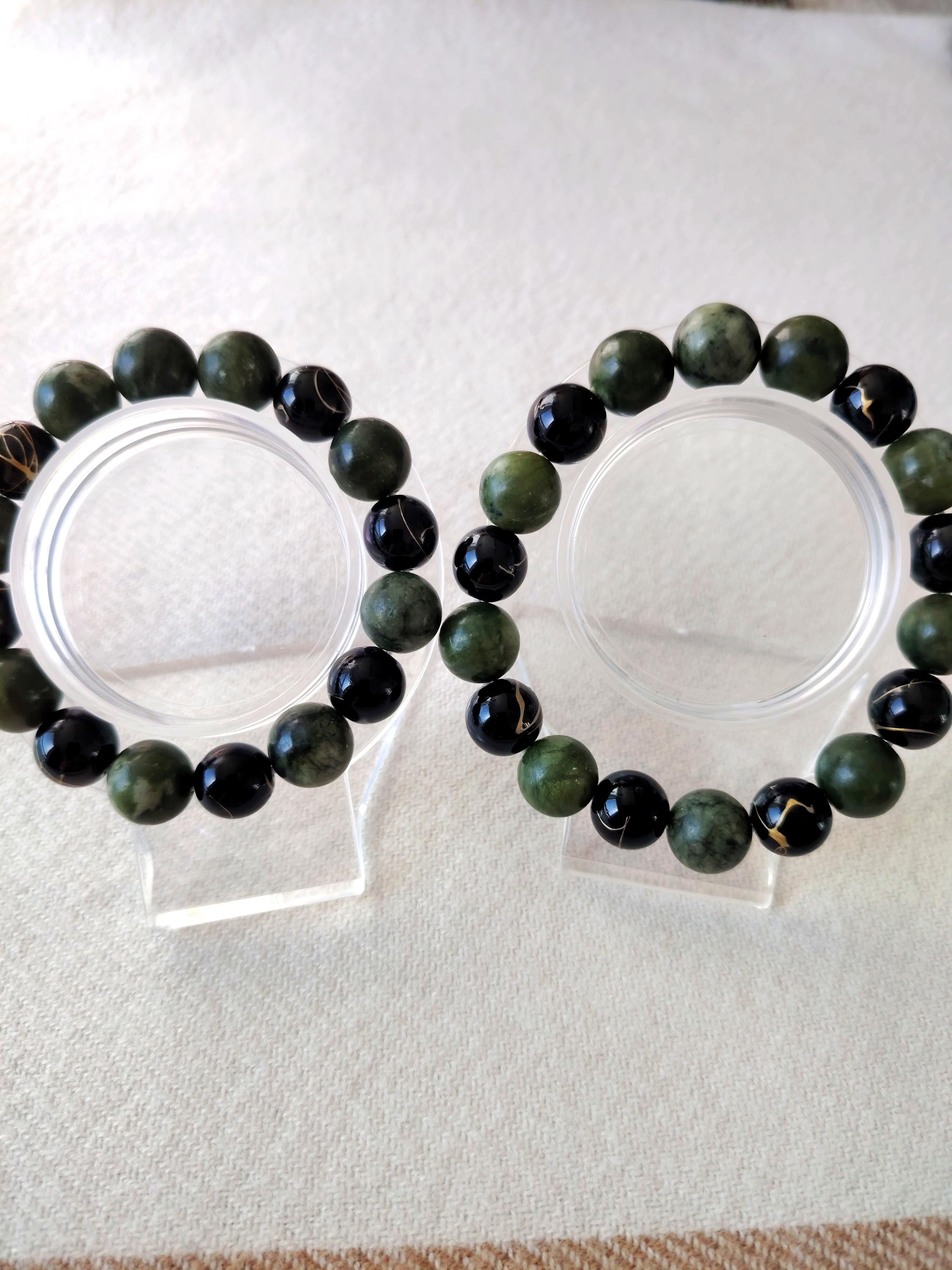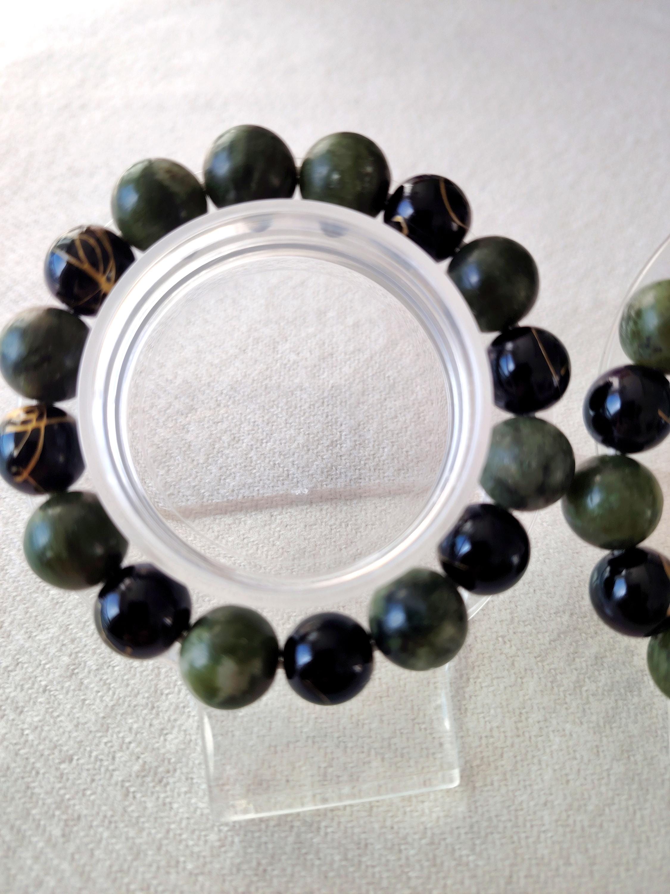 Couples Bracelets • Black Gold & Green Agate Gemstone Set (12mm Beads)