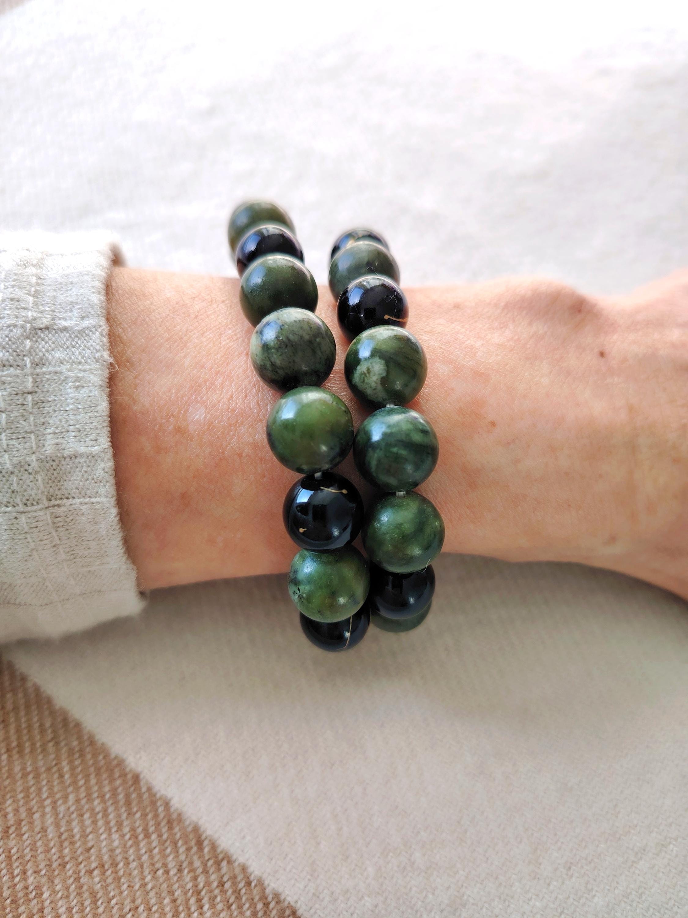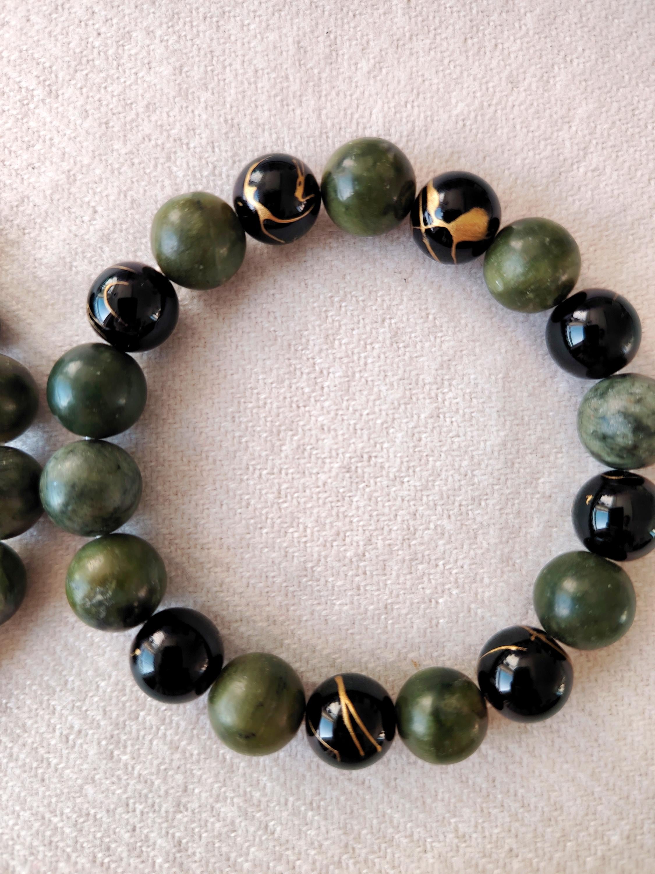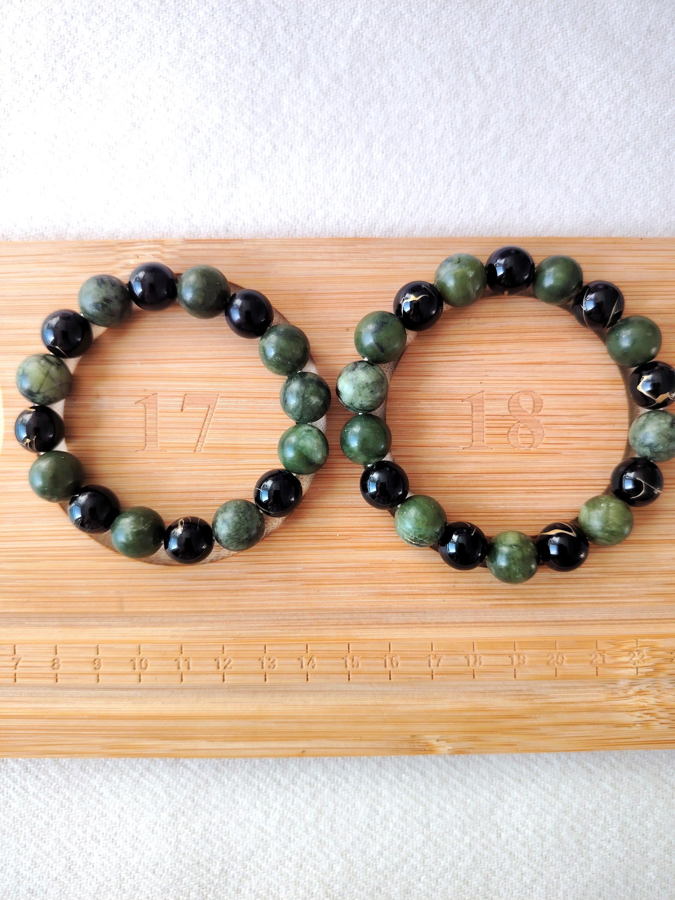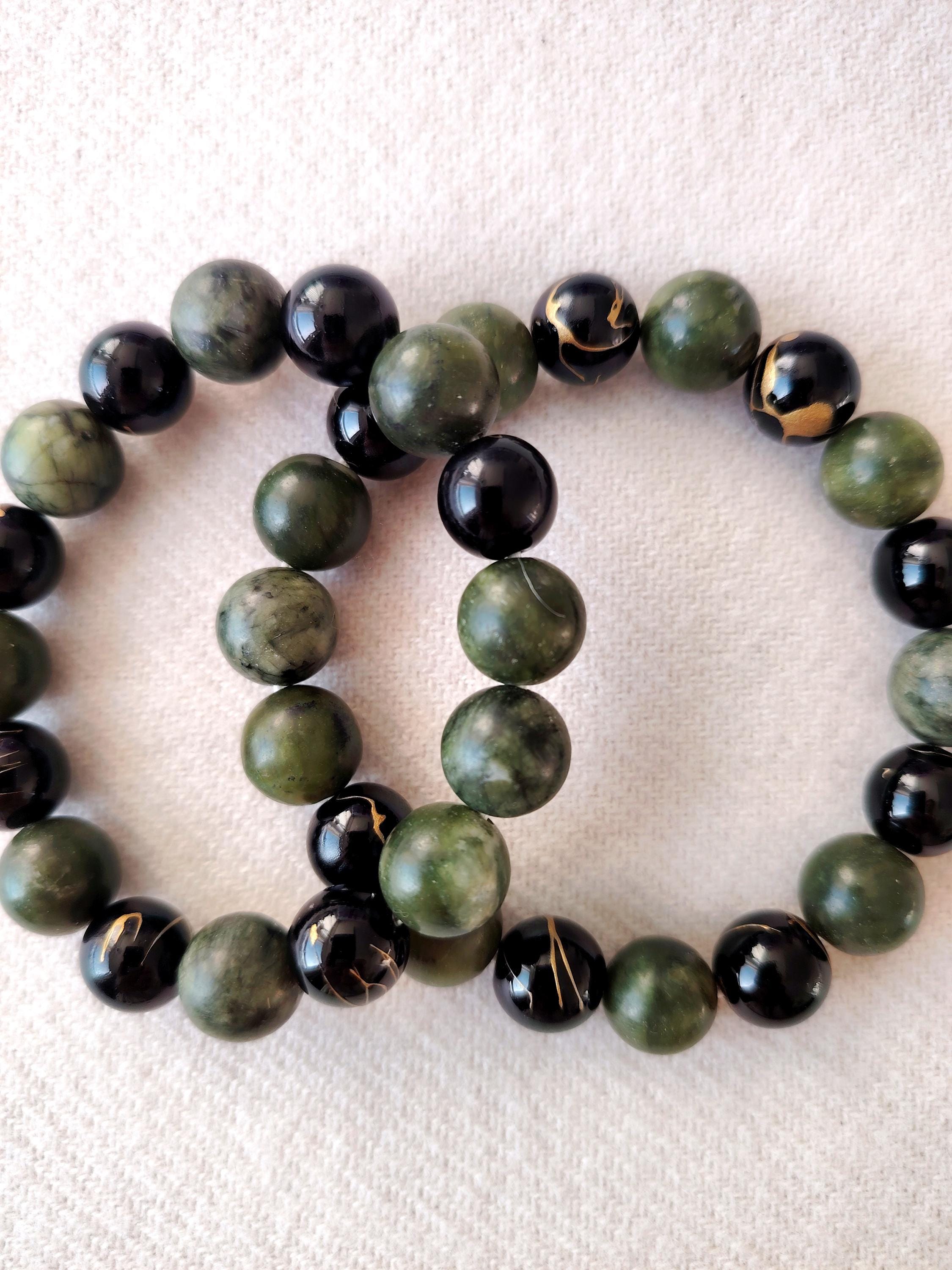 Couples Bracelets • Black Gold & Green Agate Gemstone Set (12mm Beads)